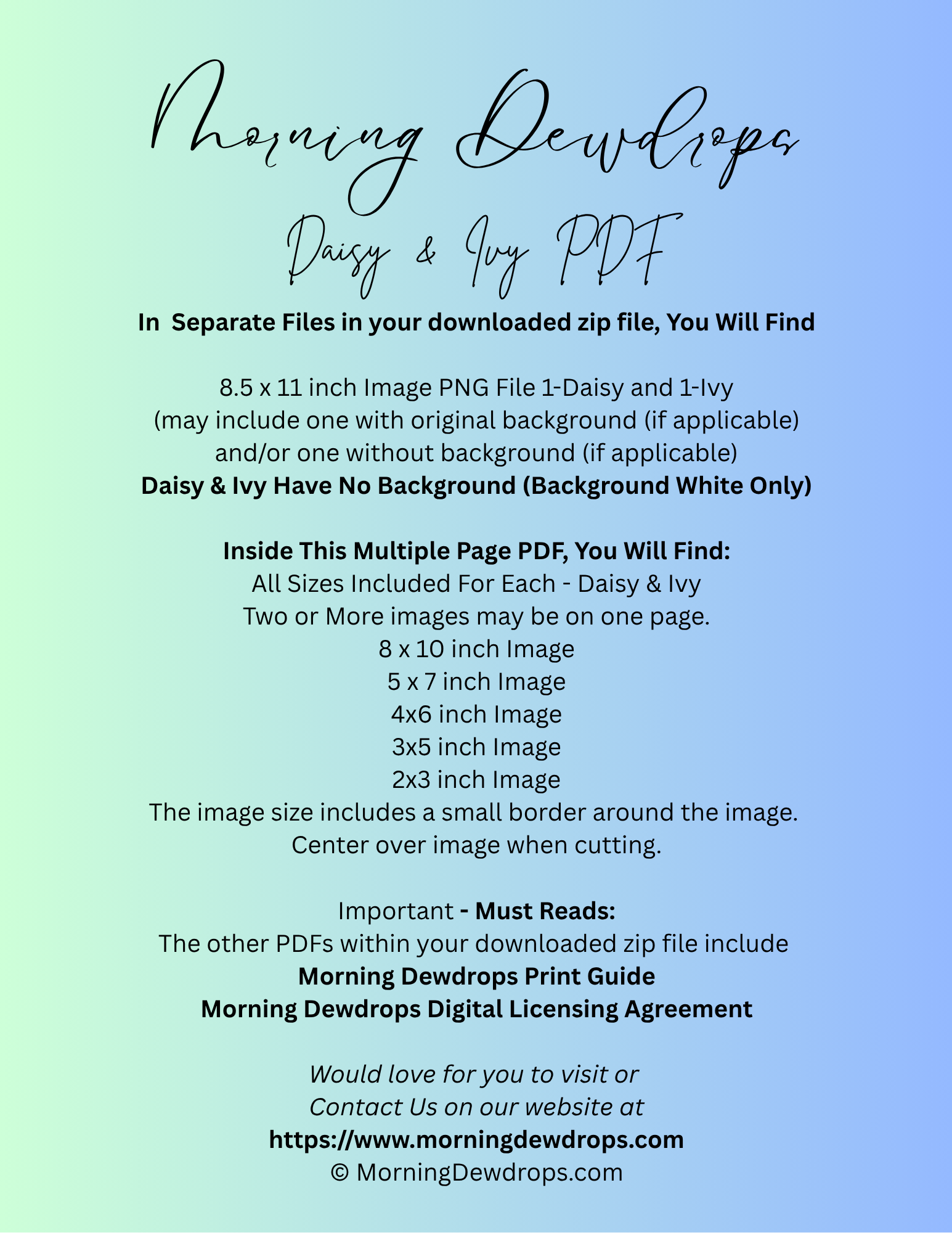• PNG Files – High-resolution 8.5x11 artwork files. You get high-resolution 8.5x11 artwork files; one of Daisy and one of Ivy (They were not painted with a background.) The 8.5x11 PNG files contained in the zip file of Daisy & Ivy are separate files. (The both of them together shown here is for description purposes only.)